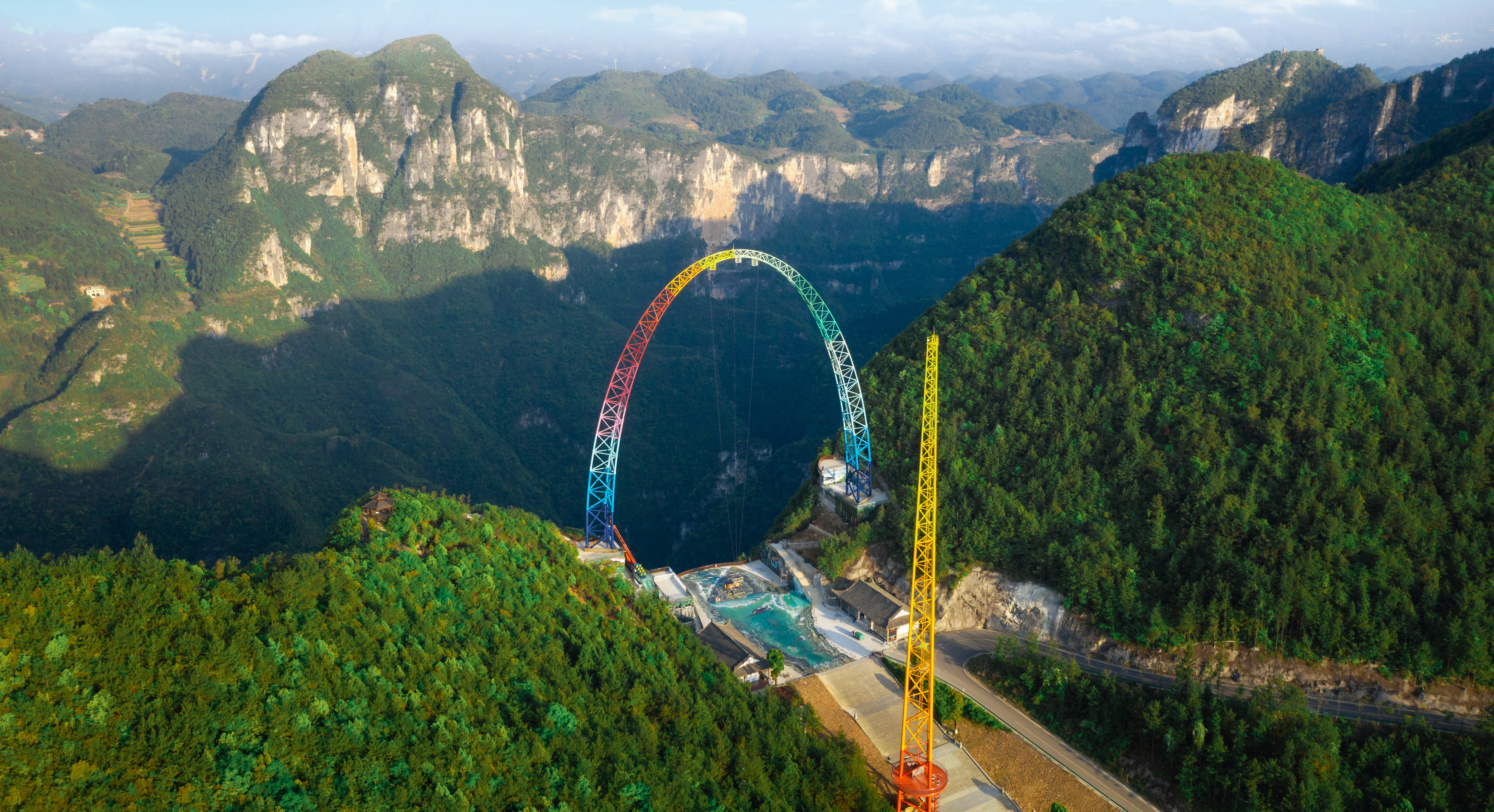 由中冶設(shè)備院自主研發(fā)、設(shè)計(jì)、制造、安裝的云端彩虹秋千,坐落于重慶龍缸5A景區(qū)700米的懸崖邊緣,主體由高100米、基礎(chǔ)跨距87.6米的彩虹涂裝拱形塔和高108米的提升發(fā)射塔等部分組成,該設(shè)備最大提升高度88m,最大運(yùn)行速度可達(dá)130km/h,以“世界最高的框架秋千”稱(chēng)號(hào)被載入吉尼斯世界紀(jì)錄。